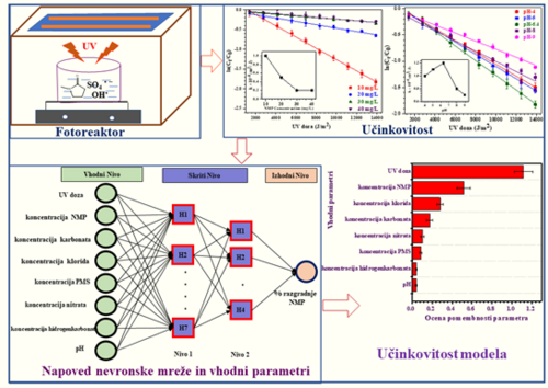 NMP je večnamensko industrijsko topilo, ki predstavlja tveganje za zdravje ljudi. Članek predstavlja prvo raziskavo razgradnje onesnaževala NMP z napredno oksidacijsko metodo UV/PMS (aktivacija peroksimonosulfata z UV svetlobo) v različnih vodnih medijih. Avtorji so opisali mehanizem razgradnje in določili vmesne produkte razgradnje. Eksperimentalne podatke so uspešno potrdili z uporabo v ta namen razvitega modela nevronskih mrež, ki omogoča napoved delovanja sistema UV/PMS za razgradnjo NMP na podlagi različnih vhodnih podatkov, kot so parametri kakovosti vode in drugi reakcijski pogoji.